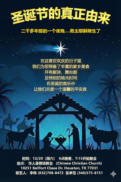 歡迎您來訪我們的網站,這是一個篤信聖經並正在成長的教會, 成員以中年工作家庭為多。聚會人數尚在百人以内。成人聚會用普通話(國語),青少年聚會則用英語。會堂位置在休士頓西南(中國城區往南約十分鈡), 離59和8號路都很近,所以從各處來都很方便。